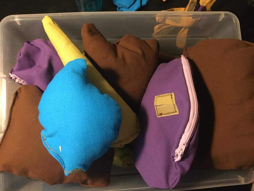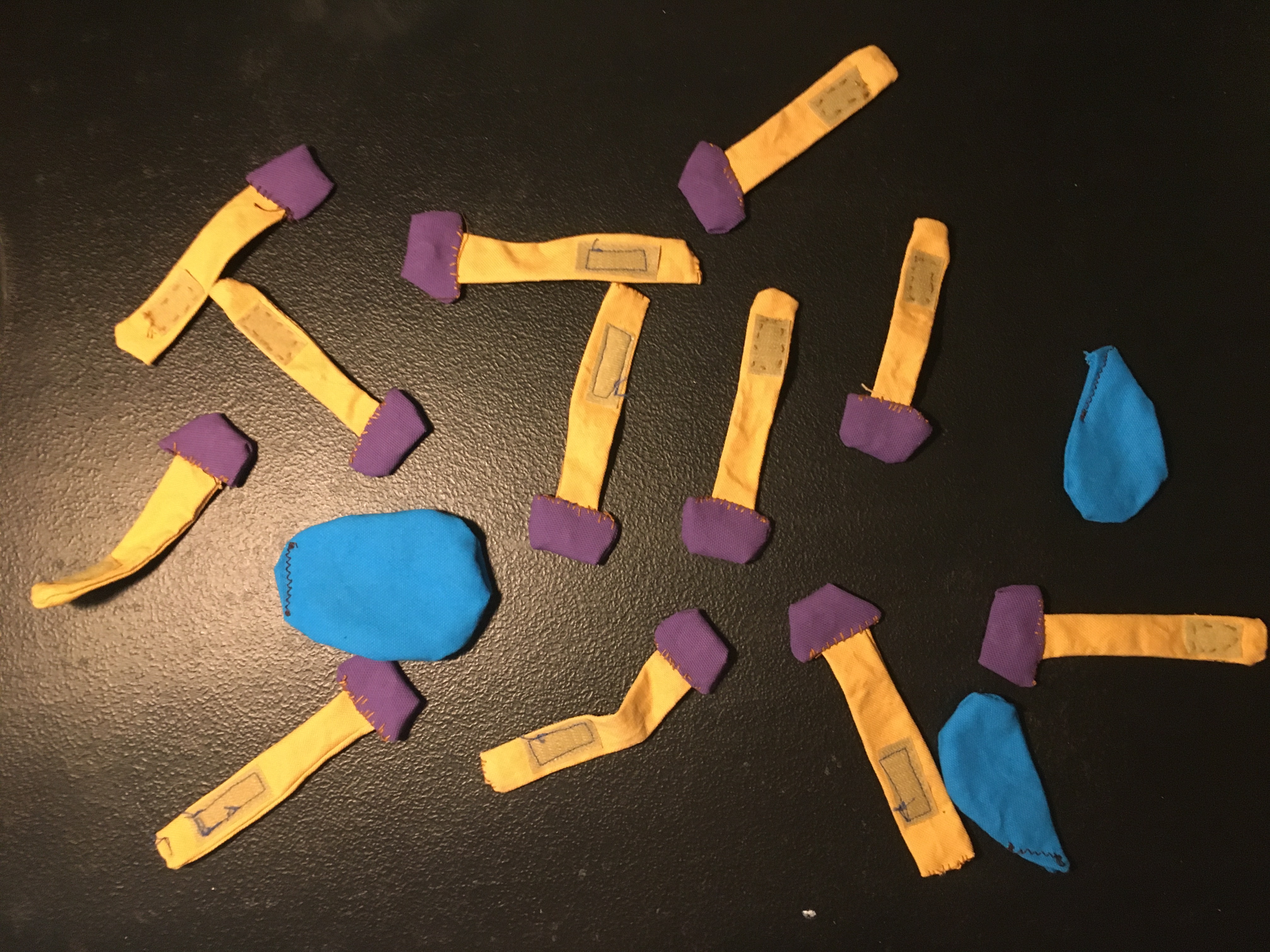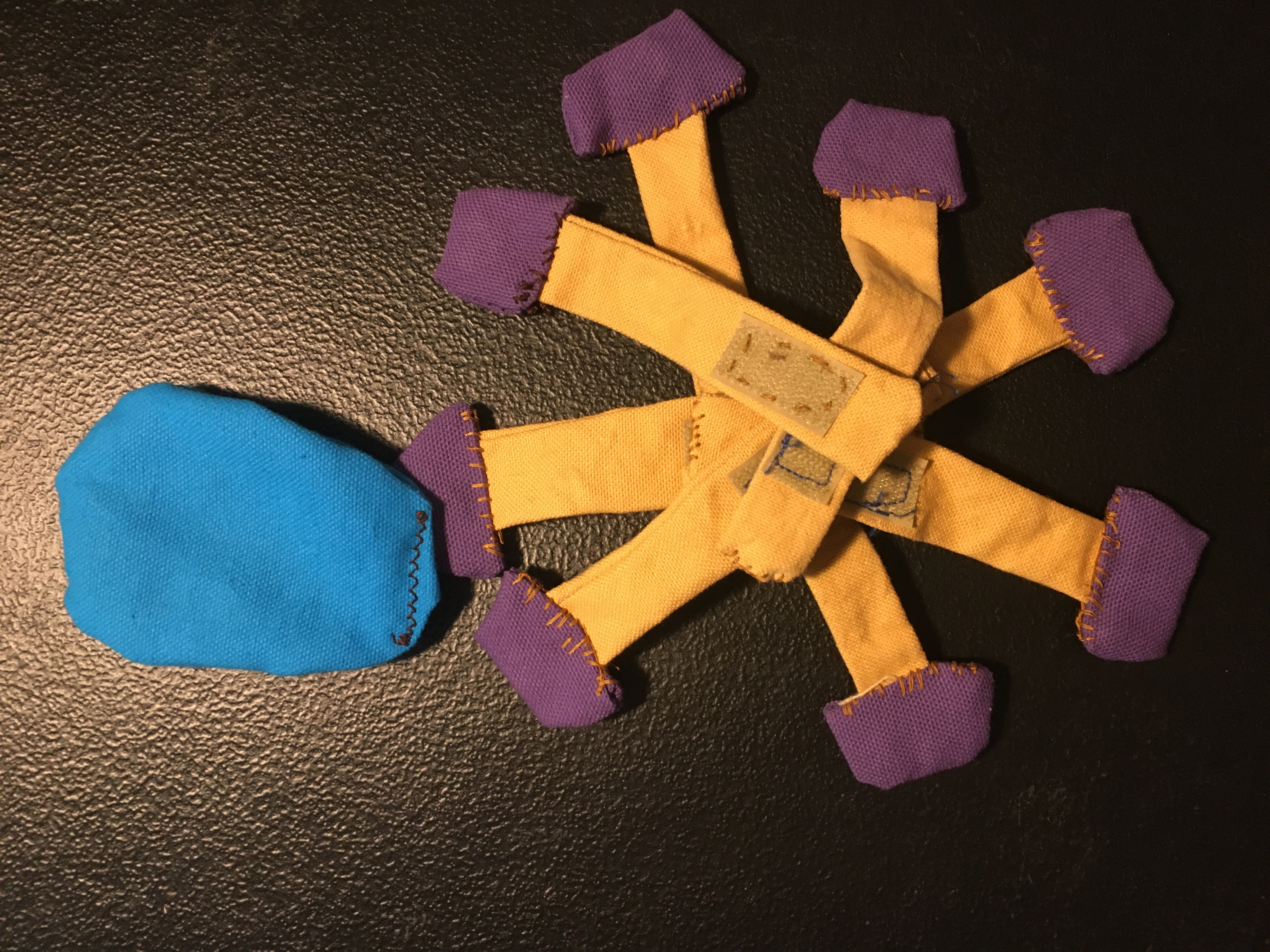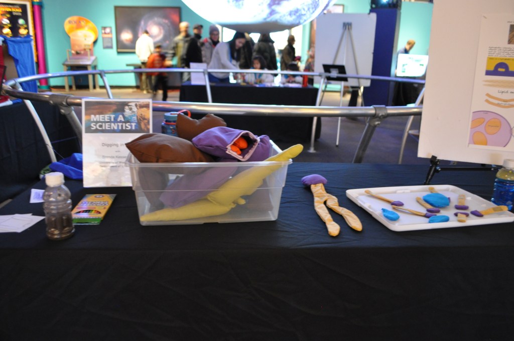 Next, I had a box full of plush mineral grains, single-cell organisms, and plant detritus. I asked participants if they could find all the soil components they saw in the real dirt in the box. I included a big drop of water to spark conversation about how water might move through soil. Most participants guessed quickly that the purple blobs were bacteria and other microorganisms, which let me segue into talking about cell membranes and the molecules that make them up.